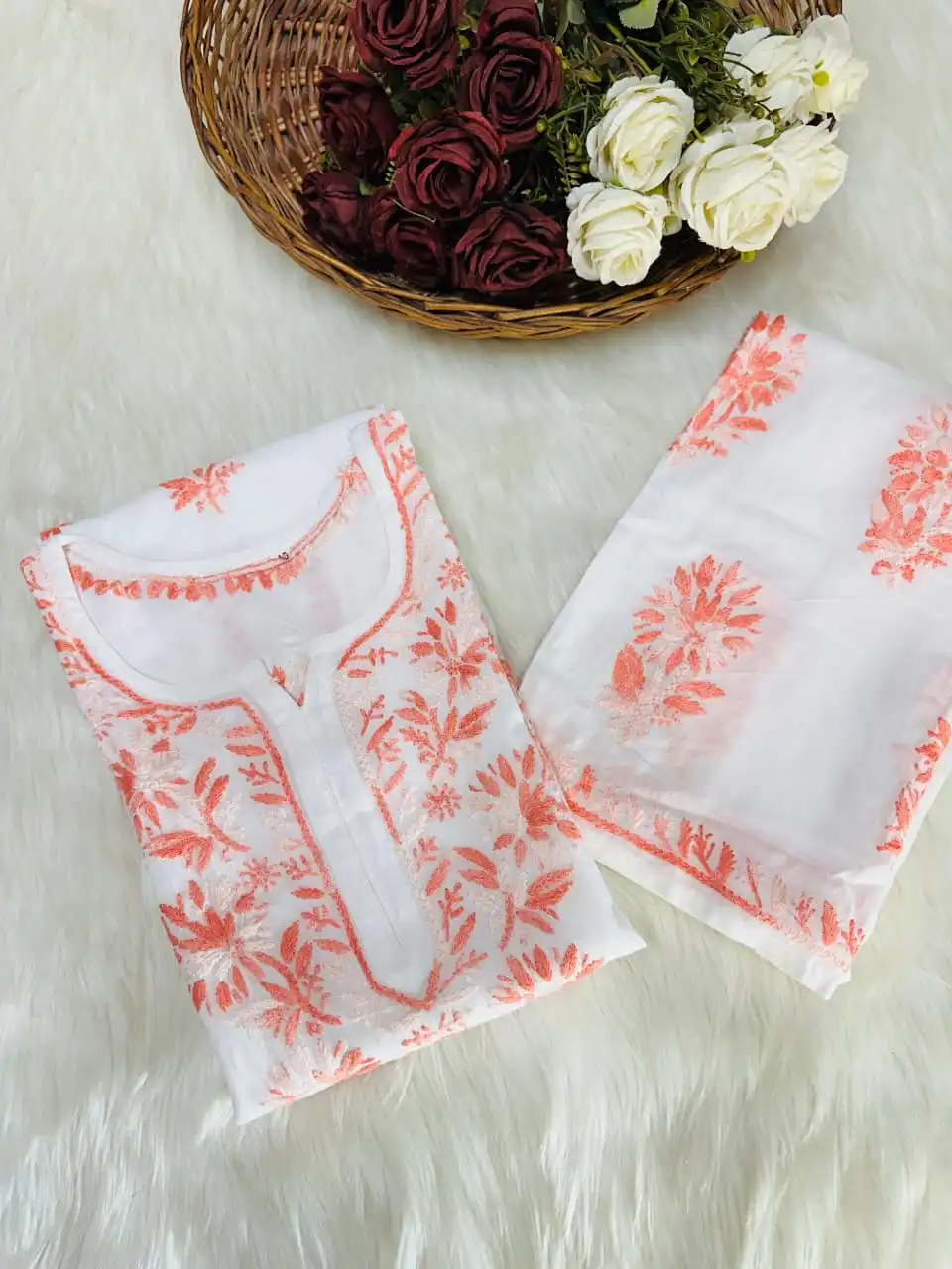 Manisha White Multithread Chikankari Kurta Set – Peach